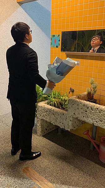 求婚當天,男方特地選了一束氣質高雅、與女方相襯的藍色花束,身穿西裝正裝。雖然已經做好萬全的準備,還是無法掩蓋緊張的神情。