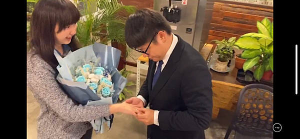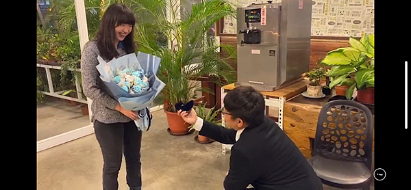 終於到了求婚當下,男方拿出準備好的花束及求婚戒指向女方求婚。從女方滿臉笑容就能夠看出,這次的求婚結果是大成功~