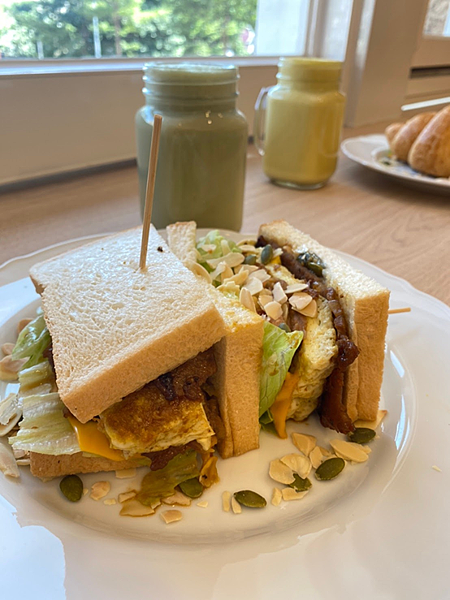我點了豬排炭烤堅果三明治、南瓜泥火腿堅果可頌、南瓜腰果奶、抹茶腰果堅果奶,看起來超好吃!