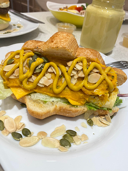 南瓜泥火腿堅果可頌我非常喜歡,香酥的可頌裡面夾綿密的南瓜泥,火腿切成細塊更增香氣,生菜、蛋、起司、堅果在其中讓口感更佳豐富!